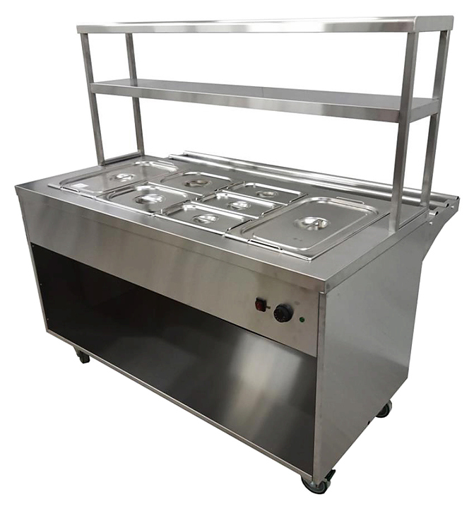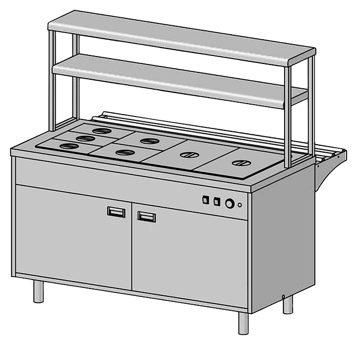 Прилавок-мармит ЦМИ Волга ПМ2пт2-150 используется в составе линии раздачи 700 Волга на предприятиях общественного питания и торговли для поддержания горячего состояния в гастроёмкостях и раздачи вторых блюд, гарниров, соусов. Модель оснащена тумбой без подогрева с распашными дверцами, паровой ванной для установки гастроемкостей и настольной 2-х уровневой полкой с подогревом галогенными лампами. Оборудование выполнено из нержавеющей стали. Комплектация: