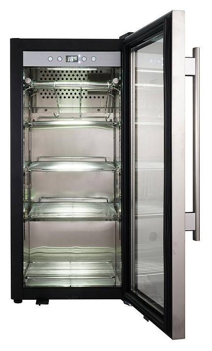 Шкаф для мяса MeatAge LUX SN-75 предназначен для охлаждения и вызревания мяса, ветчины и салями в частных домах, квартирах, отелях и офисах. Модель оснащена сенсорной панелью управления и запираемой дверцей с прочными петлями и замком. Внутренняя камера и ручки выполнены из нержавеющей стали, дверная рама - из бесшовной нержавеющей стали, дверца - из трехслойного анти-УФ стекла. В комплект поставки входят 3 хромированных полки и 2 крюка. Особенности: