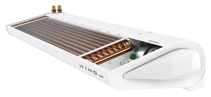 Воздушная завеса WING II W100 EC предназначена для защиты от внешнего притока холодного или теплого воздуха, пыли и неприятных запахов путем установки в дверных проемах жилых, торговых, административных и складских помещений, автосервисов, гостиниц, медицинских и общеобразовательных учреждений. Модель оснащена воздухозабоной решеткой сверху и термовыводящими направляющими снизу, а также дополнительными воздушными отверстиями и стилизованными под ювелирную огранку крышками на боковых панелях. Обтекаемый корпус в форме крыла выполнен из высококачественной оцинкованной стали с антикоррозийным покрытием порошковой краской белого цвета, трубки теплообменника – из меди. Особенности: