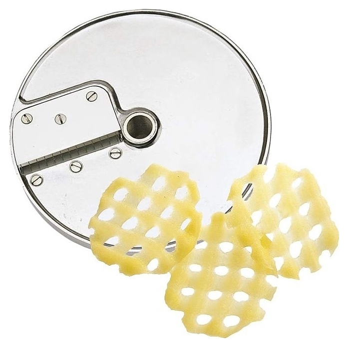 Диск для нарезки слайсами Robot Coupe 28177W серии Эксперт используется совместно с овощерезкой CL50 Gourmet для нарезки овощей и фруктов волнистыми ломтиками с дырочками гофры и дальнейшего использования их в качестве ингредиентов для приготовления супов, салатов, гарниров и пр. на предприятиях общественного питания и торговли. Диск изготовлен из алюминия с высокопрочным покрытием на минеральной основе, обеспечивающим оптимальную защиту поверхности диска и лёгкую очистку оборудования после работы. Подходит для мытья в посудомоечной машине. Характеристики: