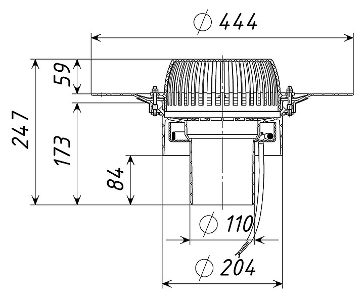 Кровельная воронка Татполимер ТП-01.У.100-Э с вертикальным выпуском используется для отвода дождевой и талой воды с плоских кровель в дождевую канализацию, для организации внешнего водостока через балконы и парапеты, для аварийного внешнего и внутреннего водостока. Воронка оснащена листвоуловителем для предотвращения попадания веток, листьев и прочего мусора в дождевую канализацию и прижимным и нижним фланцами. Корпус воронки и листвоуловитель изготовлены из полипропилена, устойчивого к ультрафиолетовому и атмосферному воздействию, фланецы - из нержавеющей стали. В комплект поставки входит корпус воронки, нижний и прижимной фланец, набор крепежа (гайки и шайбы), листвоуловитель, обод-фиксатор нагревательного элемента, саморегулирующийся кабель «TRACECO-30». мощностью 15 Вт. Дополнительные характеристики: