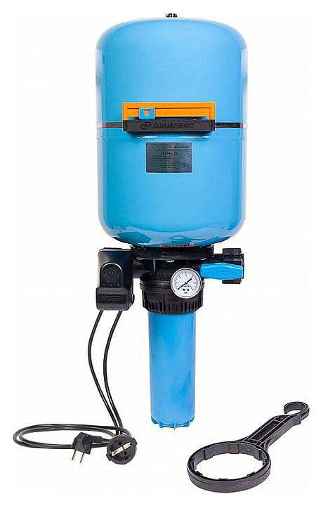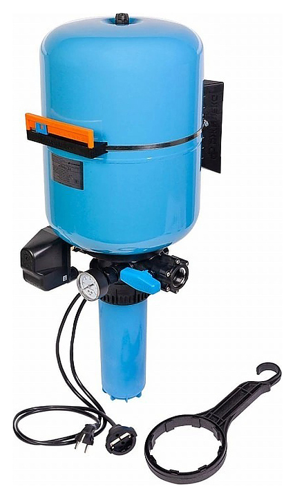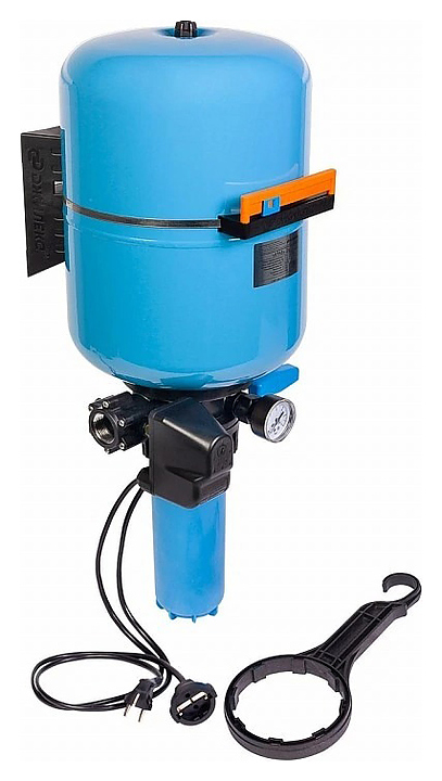 Комплект автоматизации на баке Джилекс КРАБ 24 предназначен для автоматического управления включением и выключением электронасосов, поддержания заданного давления в системах водоснабжения и предварительной фильтрации воды в частных домах. Модель оснащена гидроаккумулятором со сменной мембраной, манометром, воздушным клапаном, реле давления РДМ и сливной пробкой. Корпус выполнен из пластика. Изделие устойчиво к коррозии. В комплект поставки входят фильтрующий картридж, ключ для корпуса фильтра, кронштейн со стальным хомутом для крепления к вертикальной поверхности, площадка с датировкой и ползунком для фиксации месяца замены фильтрующего картриджа, заглушки 1/4” и 3/4” для реверса подачи воды, силовой кабель с вилкой и силовой кабель с розеткой для подачи электрического тока к насосу. Особенности: