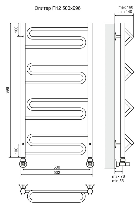 Полотенцесушитель водяной Terminus Юпитер 12П Ду 25 (1/2") ВР 50х99,6 см, нижнее подключение