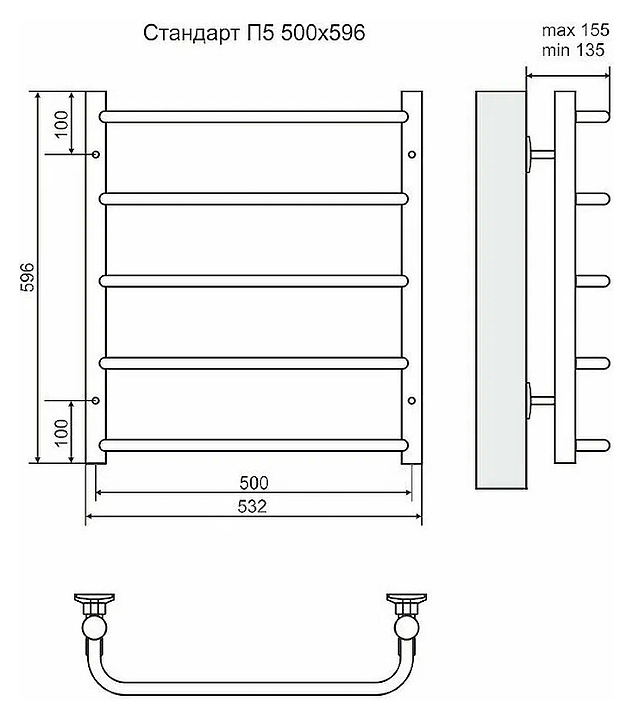 Полотенцесушитель водяной Terminus Стандарт 5П Ду 25 (1/2") ВР 50х59,6 см, нижнее подключение