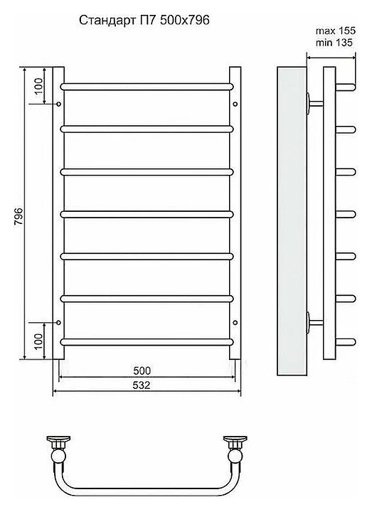 Полотенцесушитель водяной Terminus Стандарт 7П Ду 25 (1/2") ВР 50х79,6 см, нижнее подключение