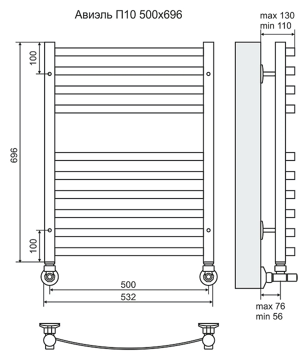 Полотенцесушитель водяной Terminus Авиэль 10П Ду 32 (1/2") ВР 50х69,6 см, нижнее подключение