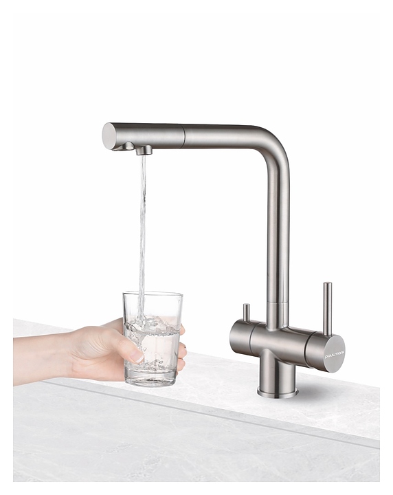 Смеситель Paulmark Skalen Sk213020-SS предназначен для подачи горячей и холодной воды в кухонных помещениях. Модель имеет дополнительный излив для фильтра и аэраторы, которые экономят расход воды, уменьшают шум и снижают количество брызг. Керамический картридж обеспечивает плавный ход рычага смесителя, контроль и точность при выборе напора и температуры воды. Изделие выполнено из нержавеющей стали, отличающейся прочностью, долговечностью и устойчивостью к коррозии. В комплект поставки входят крепления, аэратор и гибкая подводка. Дополнительные характеристики: