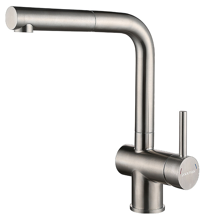 Смеситель Paulmark Dosse Do214418-SS предназначен для подачи горячей и холодной воды в кухонных помещениях. Модель оснащена выдвижным изливом и аэратором, который экономит расход воды, уменьшает шум и снижает количество брызг. Керамический картридж обеспечивает плавный ход рычага смесителя, контроль и точность при выборе напора и температуры воды. Изделие выполнено из нержавеющей стали, отличающейся прочностью, долговечностью и устойчивостью к коррозии. В комплект поставки входят крепления, аэратор и гибкая подводка. Дополнительные характеристики: