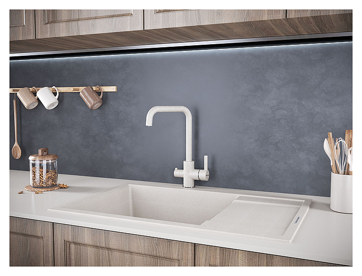 Смеситель Paulmark Logas Lo213021-328 предназначен для подачи горячей и холодной воды в кухонных помещениях. Модель имеет встроенный кран для питьевой воды и самоочищающийся аэратор, который экономит расход воды, уменьшает шум и снижает количество брызг. Керамический картридж обеспечивает плавный ход рычага смесителя, контроль и точность при выборе напора и температуры воды. Изделие выполнено из латуни, отличающейся прочностью, долговечностью и устойчивостью к перепадам температур. В комплект поставки входят крепления, аэратор и гибкая подводка. Дополнительные характеристики: