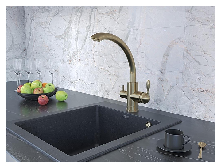 Смеситель Paulmark Essen Es213001-BR предназначен для подачи горячей и холодной воды в кухонных помещениях. Модель имеет дополнительный излив для питьевой воды и аэратор, который уменьшает шум и снижает количество брызг. Керамический картридж обеспечивает плавный ход рычага смесителя, контроль и точность при выборе напора и температуры воды. Изделие выполнено из латуни, отличающейся прочностью, долговечностью и устойчивостью к перепадам температур. В комплект поставки входят крепления, аэратор и гибкая подводка. Дополнительные характеристики: