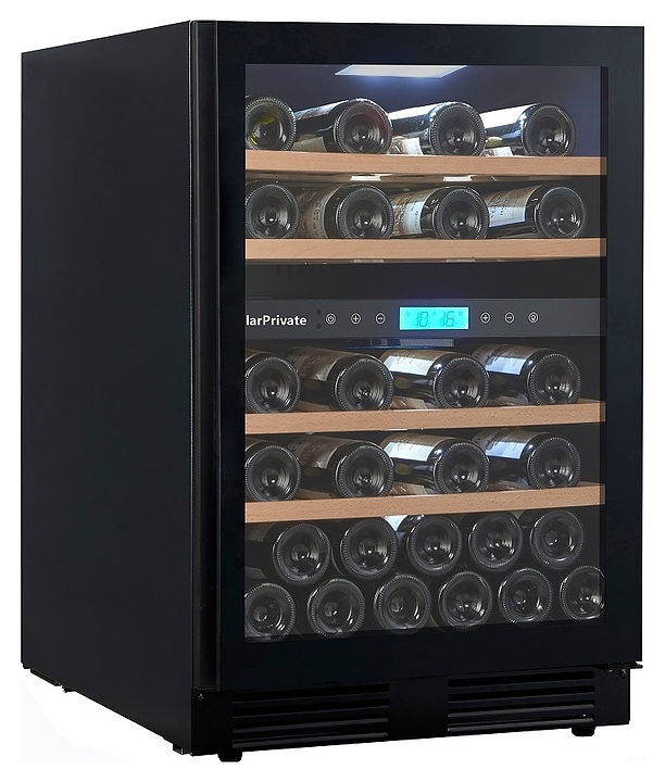Встраиваемый винный шкаф Cellar Private CP043-2TBH предназначен для хранения при оптимальных условиях бутилированного вина различных сортов в барах, ресторанах, специализированных магазинах, подсобных складских помещениях, а также в домашних условиях. Модель оснащена холодильной камерой с 2 температурными зонами, 4 съемными полками, распашной перенавешиваемой дверью со скрытой рукояткой и прозрачным тонированным обзорным стеклом, а также сенсорной панелью управления с жидкокристаллическим дисплеем внутри камеры. Корпус выполнен из металла с покрытием черного цвета, рама двери – из пластика, полки – из массива древесины. Особенности:
