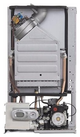 Газовый конвекционный котел Ferroli Divatech D F37 предназначен для совместного использования в системах отопления и водоснабжения в жилых и загородных частных домах, а также других бытовых и хозяйственных объектах. Модель оснащена горелкой Polidoro (Италия) с 17 форсунками, расширительным баком CIMM (Италия), 3-скоростным циркуляционным насосом Wilo (Франция), 2 раздельными теплообменниками, 3-ходовым клапаном с электроприводом, вентилятором Fime (Италия), резьбовыми штуцерами для подключения газа, отопительного контура, подвода холодной и выхода горячей воды, дымовыводящим отверстием, кабелем питания типа HAR H05 VV-F и электронной панелью управления с жидкокристаллическим дисплеем. Вертикально ориентированный корпус с прямоугольными гранями выполнен из стали с антикоррозийным покрытием белого цвета, основной теплообменник Valmex (Италия) – из меди, пластинчатый теплообменник ГВС Gidex (Италия) – из нержавеющей стали, гидравлическая группа – из высокопрочных композитных материалов Bitron (Италия).
