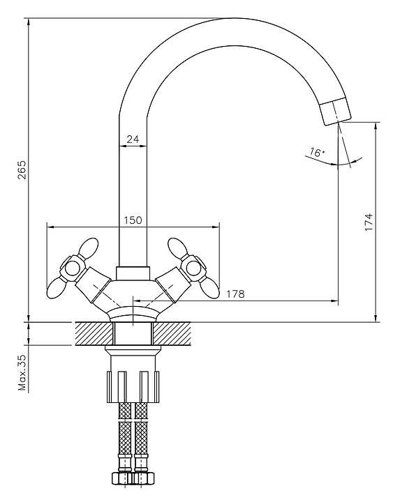 Смеситель Decoroom DR53028 предназначен для использования на кухне для подачи горячей и холодной воды. Модель оснащена удобными вентилями и высоким поворотным изливом. Изделие выполнено из металла, который отличается прочностью, долговечностью и устойчивостью к перепадам температур. Особенности: