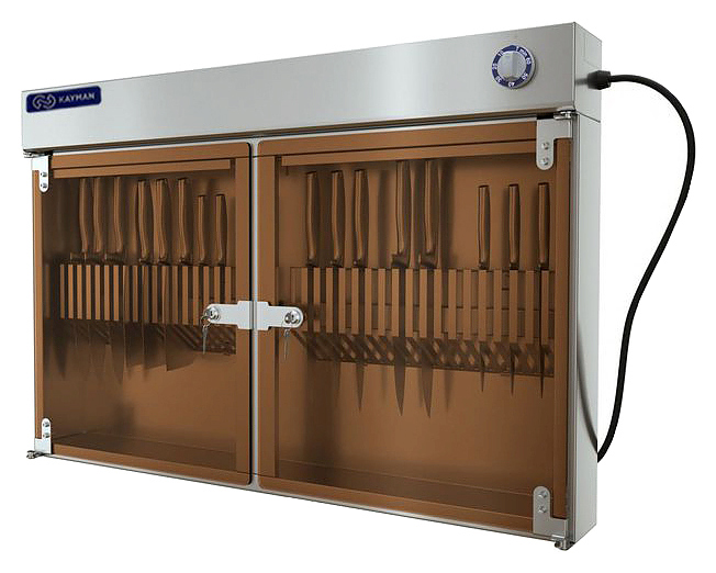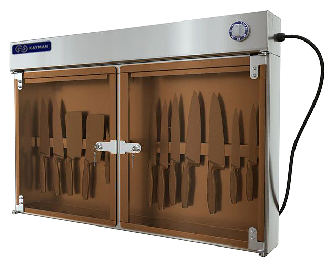 Стерилизатор для ножей KAYMAN СН-2-36-Р-М А используется на предприятиях общественного питания и торговли для дезинфекции ножей и других инструментов. Модель оснащена ртутной лампой, таймером от 0 до 60 минут и 2 дверцами с замками. Корпус выполнен из нержавеющей стали AISI430, дверцы - из тонированного стекла, обеспечивающего защиту персонала от ультрафиолетовых лучей, держатель - из нержавеющей стали, колба - из увиолевого стекла. В комплект поставки входят 2 решетки-держателя и 2 магнитных держателя для ножей. Особенности: