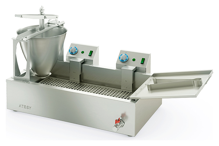 Пончиковый аппарат ATESY Гольфстрим-2-30-3 используется на предприятиях общественного питания и торговли для формирования и приготовления в разогретом масле пончиков традиционной формы. Модель оснащена фритюрной ванной, ручным дозатором теста, 2 блоками управления с электронагревателями и поддоном для выкладки готовых пончиков. Все части аппарата, контактирующие с продуктами питания, изготовлены из пищевой нержавеющей стали. В комплект поставки входит кулинарный пинцет. Особенности: