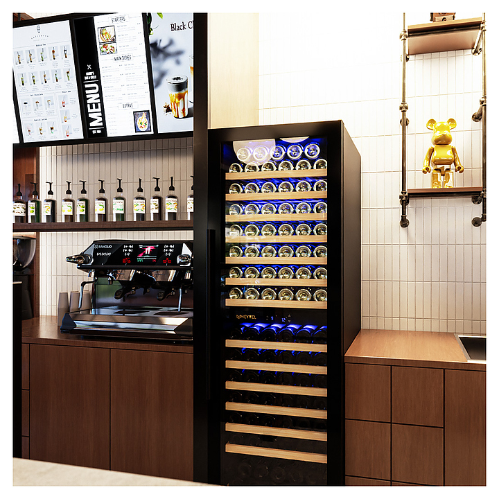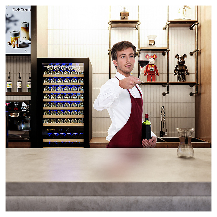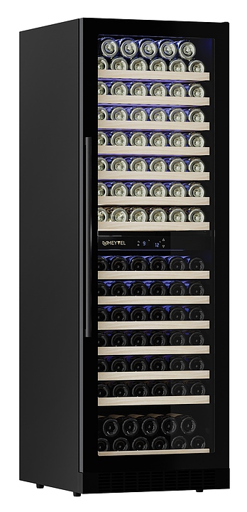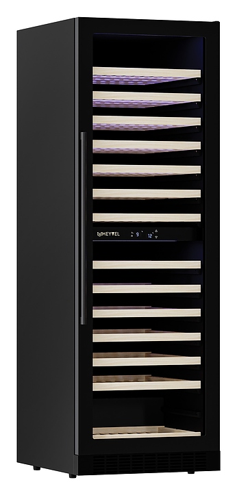 Винный шкаф MEYVEL MV163-KBT2 предназначен для демонстрации, хранения и создания оптимальных условий для сохранения всех вкусовых свойств вина в бутылках на предприятиях общественного питания, торговли, в барах, ресторанах, специализированных магазинах, частных домах или квартирах. Модель оснащена сенсорной панелью управления, электронным термостатом и синей внутренней светодиодной подсветкой. Корпус и дверная ручка выполнены из окрашенной в черный цвет стали, дверь - из двойного стекла с УФ защитой с черной рамкой, полки - из массива бука. Особенности: