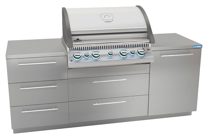 Модульная кухня КАМИК Альфа предназначена для приготовления большого ассортимента блюд на гриле на летних площадках предприятий общественного питания и торговли, гостиниц, а также во дворах, беседках или на верандах частных жилых или дачных домов. Модули выполнены из высококачественной нержавеющей стали марки AISI 304. Гриль и вытяжка не входят в комплект поставки и заказываются отдельно. Комплектация: