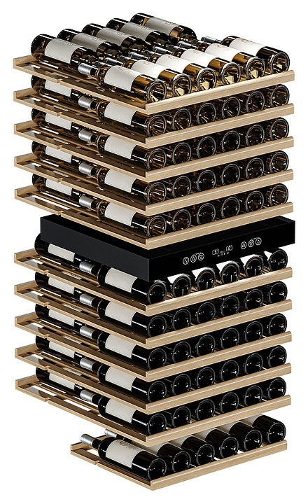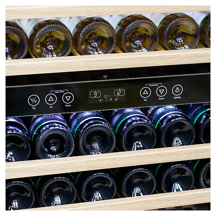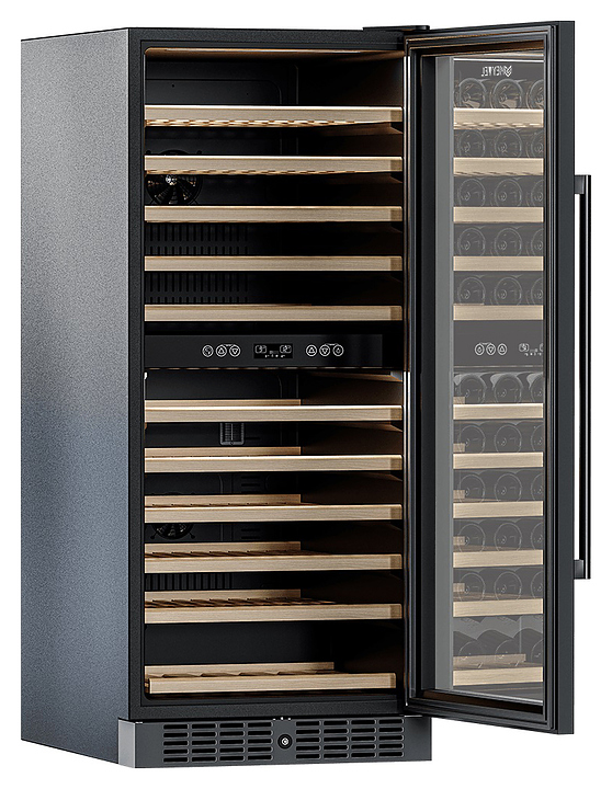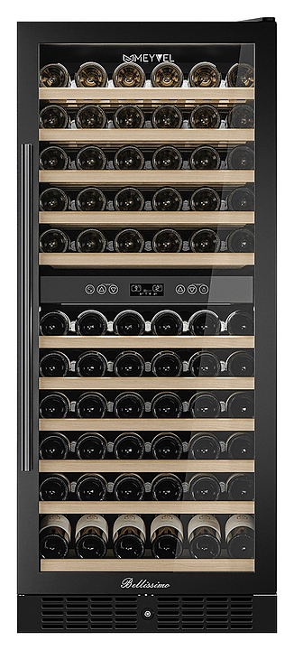 Винный шкаф MEYVEL MV116-KBT2 предназначен для демонстрации, хранения и создания оптимальных условий для сохранения всех вкусовых свойств вина в бутылках на предприятиях общественного питания, торговли, в барах, ресторанах, специализированных магазинах, частных домах или квартирах. Модель оснащена сенсорной панелью управления, 2 электронными термостатами и внутренней светодиодной подсветкой. Корпус и дверная ручка выполнены из окрашенной в черный цвет стали, дверь - из тройного стекла с УФ защитой с черной рамкой, полки - из массива бука. В комплект поставки входят петли для перенавешивания двери. Особенности: