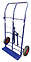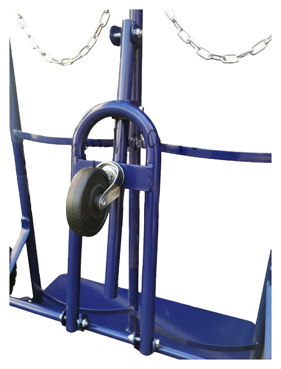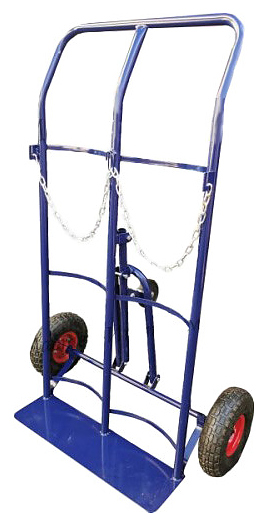 Тележка Мастер-инструмент HT1702 предназначена для единовременной транспортировки 2 газовых баллонов, а также других крупногабаритных и тяжелых грузов на складах, строительных и сельскохозяйственных объектах, предприятиях общественного питания, торговли и других отраслей. Модель оснащена 2 секциями со сплошной платформой, дугообразной ведущей рукояткой, 2 цепями для фиксации груза, 2 осевыми пневматическими колесами с не симметричной ступицей, а также откидной опорой с поворотным роликом. Вертикально ориентированная сварная рама выполнена из профиля металлической трубы круглого сечения с антикоррозийным покрытием краской синего цвета, цепи – из оцинкованной стали. Дополнительные характеристики: