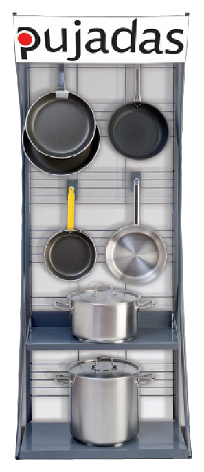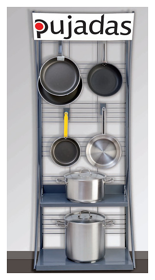 Стенд Pujadas 255.000 используется на предприятиях торговли для эффектной предпродажной демонстрации кухонного инвентаря. Модель оснащена решетчатой задней стенкой для размещения крючков и 2 сплошными полками. Инвентарь не входит в комплект поставки и заказывается отдельно. Особенности: