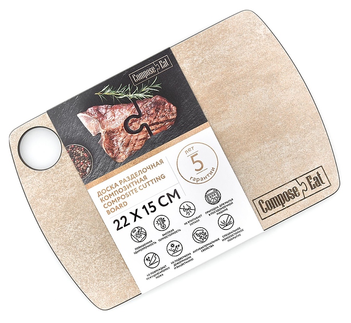 Разделочная доска ComposeEat DR2201500433KL6 из монолитного материала на основе многослойной крафтовой бумаги и имеет защитное гипоаллергенное покрытие с антибактериальными свойствами. Композитный материал сохраняет целостность при падении, ударах и механической нагрузке, устойчив к резким перепадам температур, не деформируется от влаги и не подвержен деформации, выцветанию, сколам, трещинам и механическим повреждениям. Особенности: