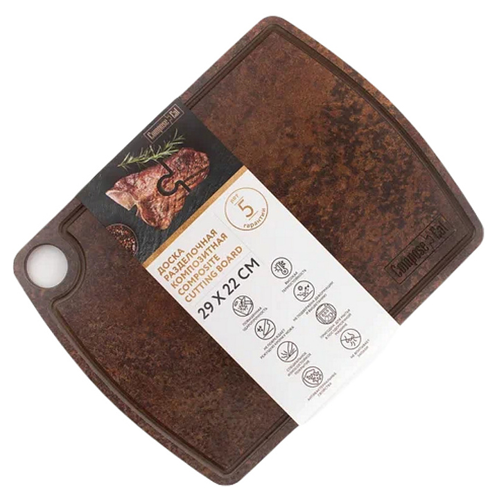 Разделочная доска ComposeEat DRJ2902250409KL6 из монолитного материала на основе многослойной крафтовой бумаги и имеет защитное гипоаллергенное покрытие с антибактериальными свойствами. Композитный материал сохраняет целостность при падении, ударах и механической нагрузке, устойчив к резким перепадам температур, не деформируется от влаги и не подвержен деформации, выцветанию, сколам, трещинам и механическим повреждениям. Модель оснащена желобом. Особенности: