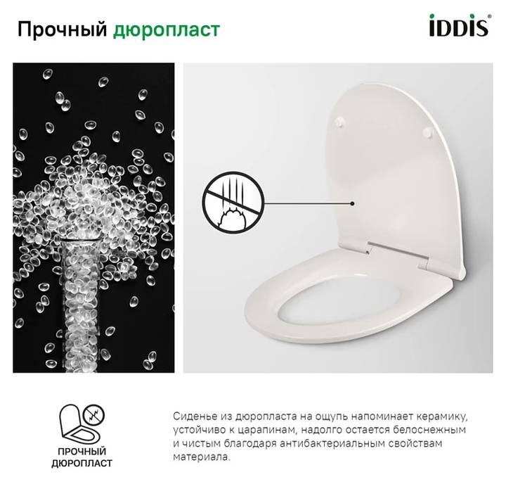 Сиденье IDDIS Optima Home 003DPSEi31 предназначено для унитазов. Быстросъемная конструкция облегчает обслуживание этого сиденья за счет фиксации на месте быстроразъемным шарниром. Встроенный механизм мягкого закрывания Soft Close не дает сиденью резко опускаться, обеспечивая бесшумное использование, и предотвращает появление трещин, царапин и сколов. Изделие выполнено из дюропласта обладающего повышенной устойчивостью к механическим воздействиям, влажности и средствам дезинфекции, а также антибактериальным эффектом. Особенности: