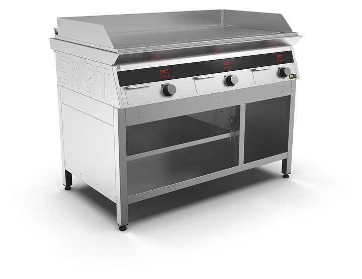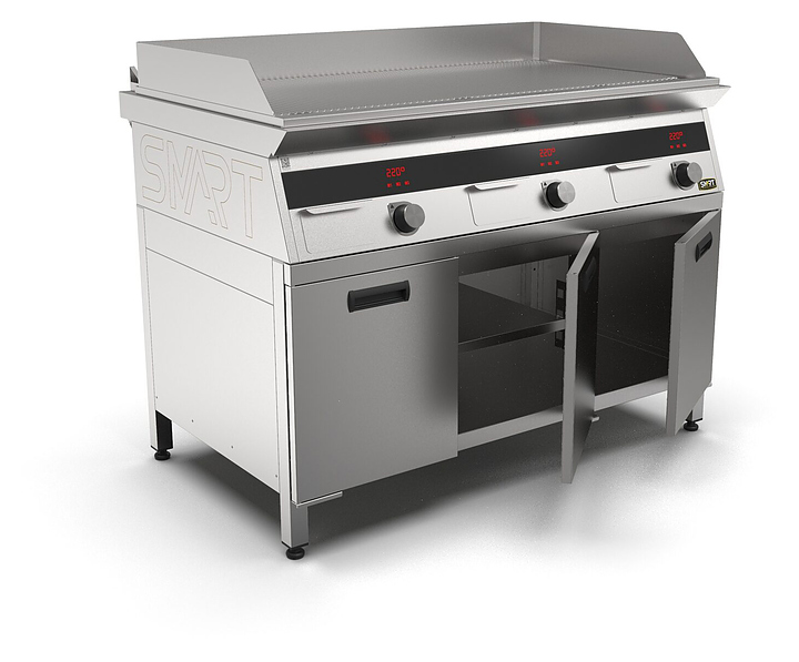 Индукционный гриль SMART INDUCTION G96-RN предназначен для приготовления мясных, рыбных и овощных блюд на предприятиях общественного питания и торговли. Модель оснащена электронно-механической панелью управления с цифровой индикацией и сенсорными кнопками, съемным жировым фильтром для отделения жира и влаги от поступающего внутрь аппарата воздуха, ящиком для сбора жира и регулируемыми по высоте ножками. Корпус и столешница выполнены из нержавеющей стали AISI430, рабочая поверхность и передняя панель - из нержавеющей стали. Особенности: