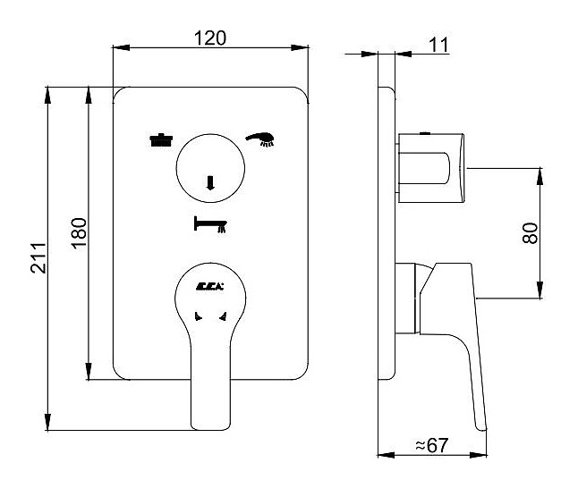 Смеситель для ванны и душа E.C.A. Luna 102167306EX-K предназначен для подачи горячей и холодной воды в ванных помещениях. Однорычажный тип управления позволяет очень быстро и плавно регулировать подачу воды одной рукой. Изделие выполнено из латуни, которая отличается прочностью, долговечностью и устойчивостью к перепадам температуры. Внутренняя часть в комплект поставки не входит. Особенности: