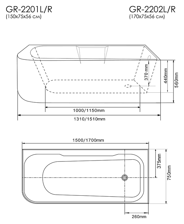 Ванна Grossman GR-2202L 170x75 см, левая, белая, акрил