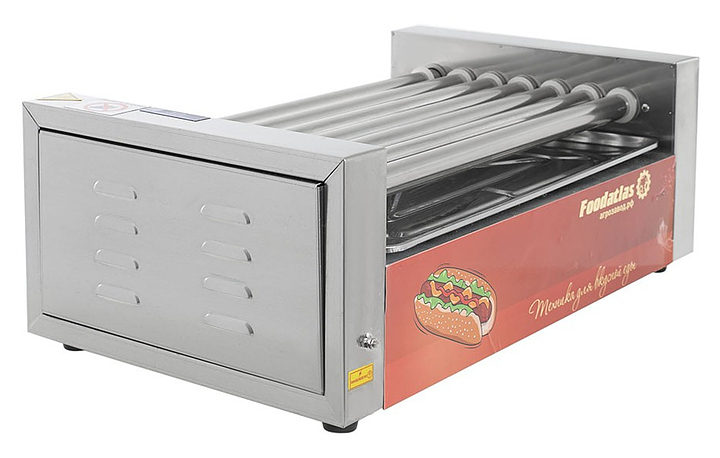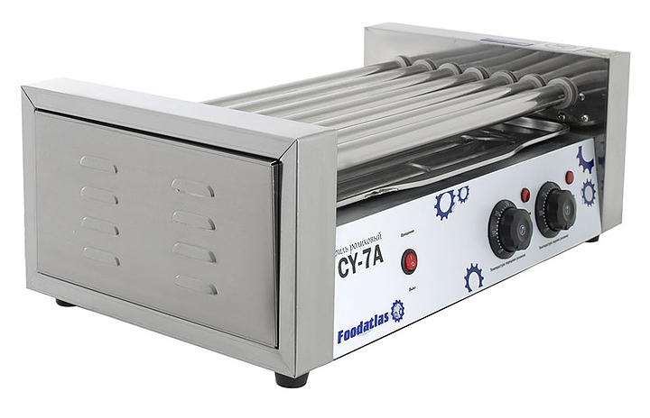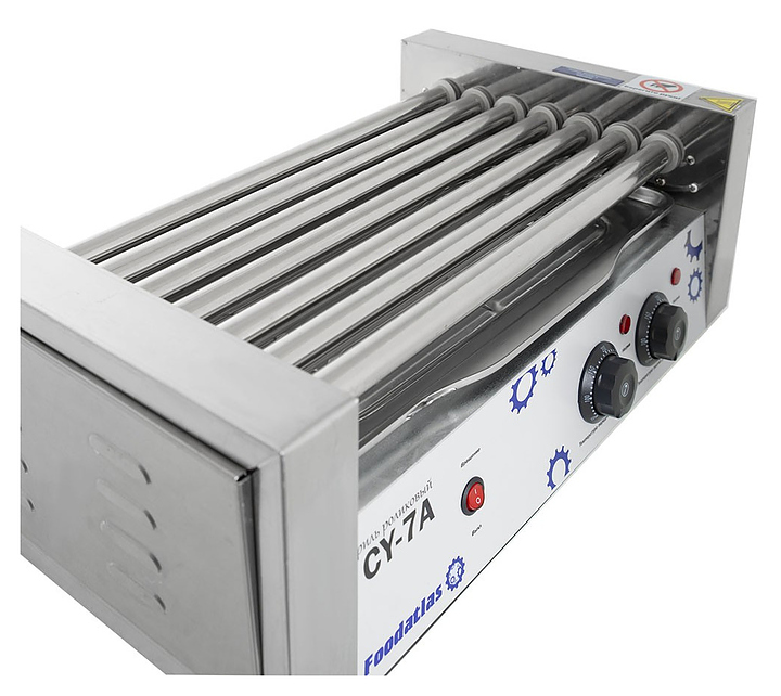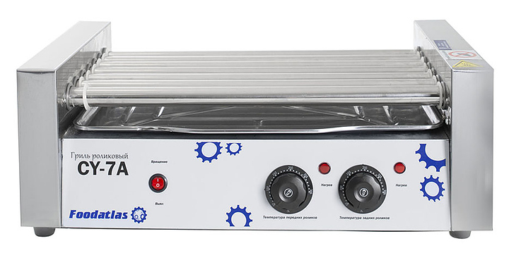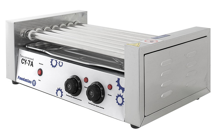 Роликовый гриль Foodatlas CY-7A предназначен для быстрого равномерного обжаривания сосисок, сарделек и колбасок на предприятиях общественного питания и торговли. Модель оснащена 2 терморегуляторами, 7 ТЭНами, уплотнительными силиконовыми кольцами на торцах роликов и подсветкой. Корпус и ролики выполнены из нержавеющей стали. Особенности: