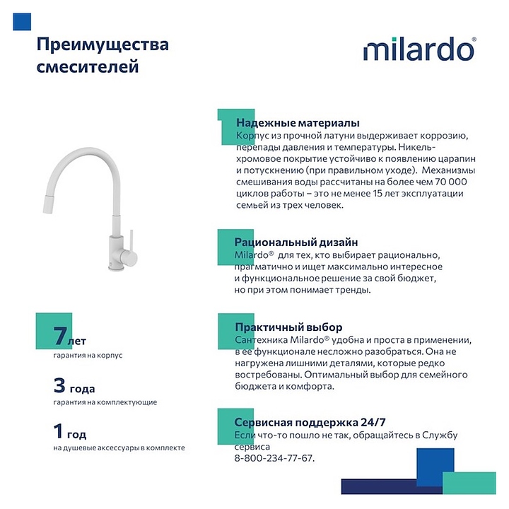 Смеситель для кухни Milardo Meal M01WT0FM05 выполнен в современном стиле и используется для подачи и смешивания горячей и холодной воды. Модель оснащена гибким изливом с усиленной стальной конструкцией внутри и термостойкой силиконовой оболочкой снаружи, керамическим картриджем, обеспечивающим плавный ход рычага смесителя, контроль и точность при выборе напора и температуры воды, а также аэратором для создания мягкой ровной струи без разбрызгивания. Изделие выполнено из высококачественной латуни, которая отличается прочностью, долговечностью и устойчивостью к перепадам температур, с устойчивым к износу и эрозии комбинированным покрытием, благодаря которому не теряет презентабельный вид. В комплект поставки входит гибкая подводка и крепеж. Особенности: