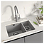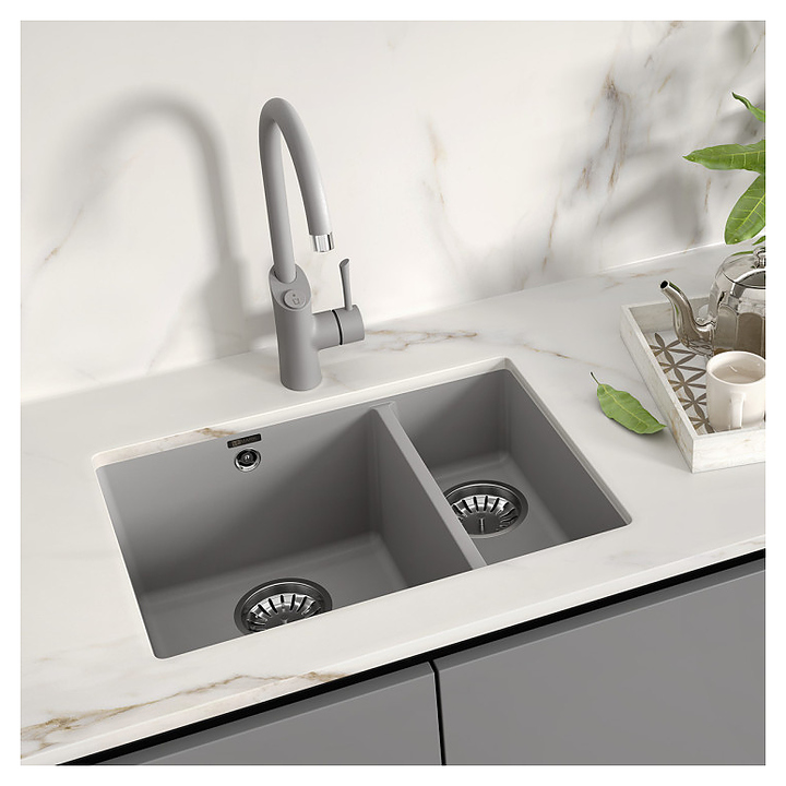 Мойка LEMARK Sinara 550.2-U предназначена для рационального планирования рабочего места на кухне. Вместительная чаша большого размера и небольшая дополнительная чаша располагаются параллельно друг другу. Изделие выполнено из кварцгранита, который выдерживает колебания температуры, имеет высокую прочность и стойкость к пищевым и химическим красителям. В комплект поставки входят крепления, сливная арматура с круглым переливом и сифон с возможностью подключения посудомоечной или стиральной машины. Особенности: