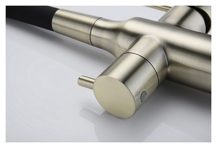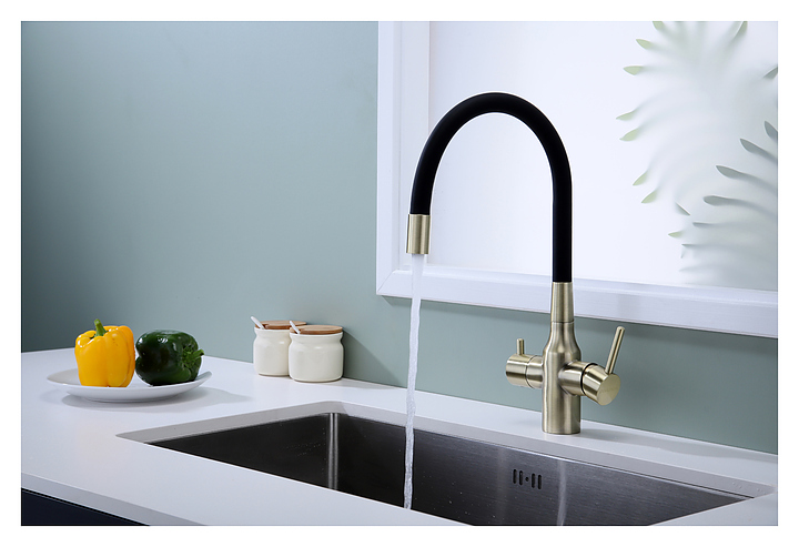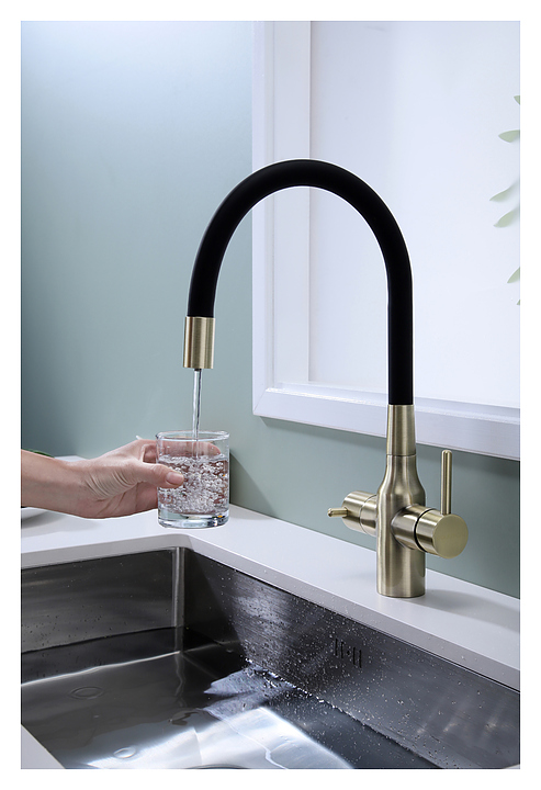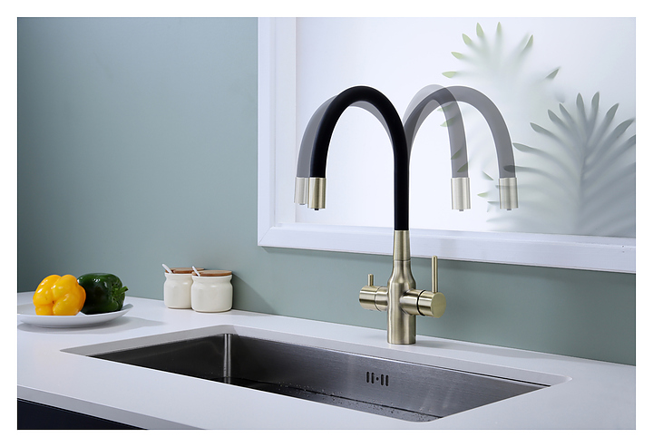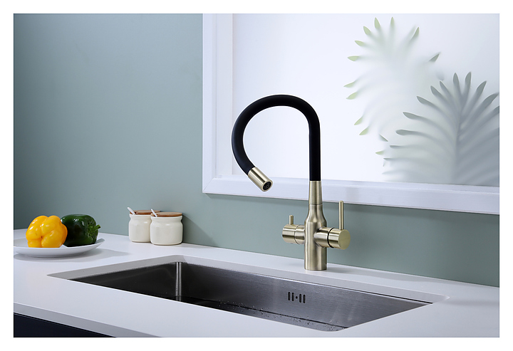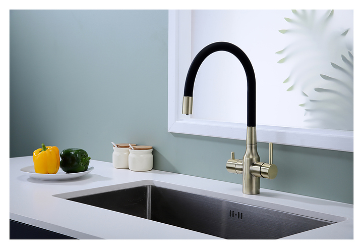 Смеситель Paulmark Salix Sa213419-BR предназначен для подачи горячей и холодной воды в кухонных помещениях. Гибкий излив с фиксацией обеспечивает оптимальный диапазон движения. Отдельное подключение фильтра для питьевой воды гарантирует, что питьевая и водопроводная вода не смешиваются. Изделие выполнено из латуни, отличающейся прочностью, долговечностью и устойчивостью к перепадам температур, излив - из силикона. В комплект поставки входят гибкая подводка из нержавеющей стали, усиленный комплект крепления, выход для подключения системы фильтрации воды, переходник цанга для подключения фильтра. Дополнительные характеристики:
