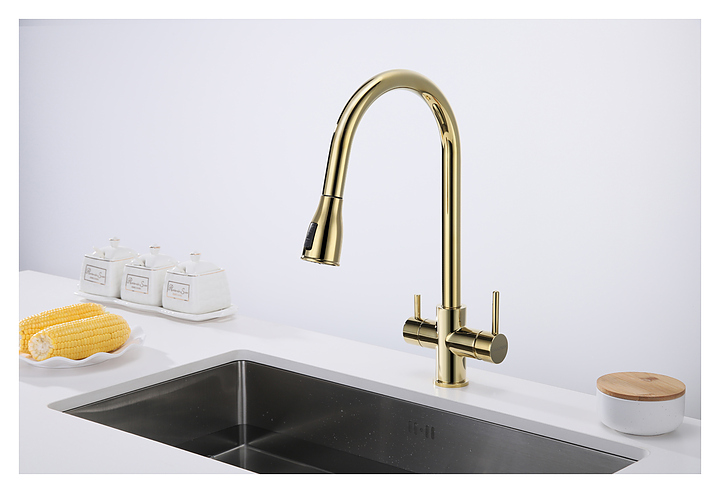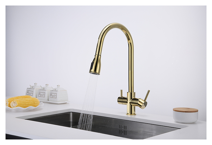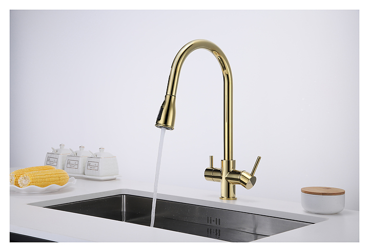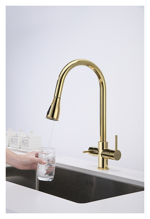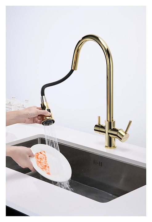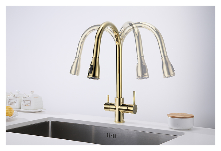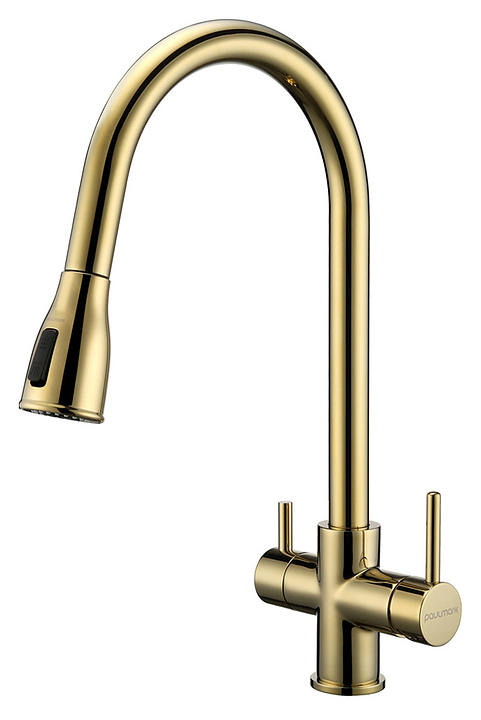 Смеситель Paulmark Lange La214212-G предназначен для подачи горячей и холодной воды в кухонных помещениях. Вытяжной шланг облегчает процесс мойки посуды или продуктов любого размера и формы. Подключение фильтра для питьевой воды гарантирует, что питьевая и водопроводная вода не смешиваются. Изделие выполнено из латуни, отличающейся прочностью, долговечностью и устойчивостью к перепадам температур. В комплект поставки входят гибкая подводка из нержавеющей стали, усиленный комплект креплений и запасной аэратор. Дополнительные характеристики: