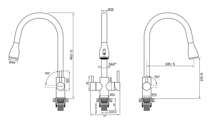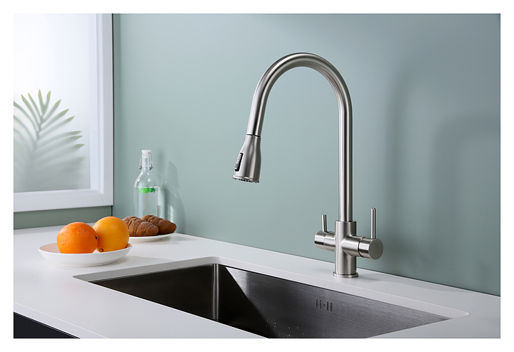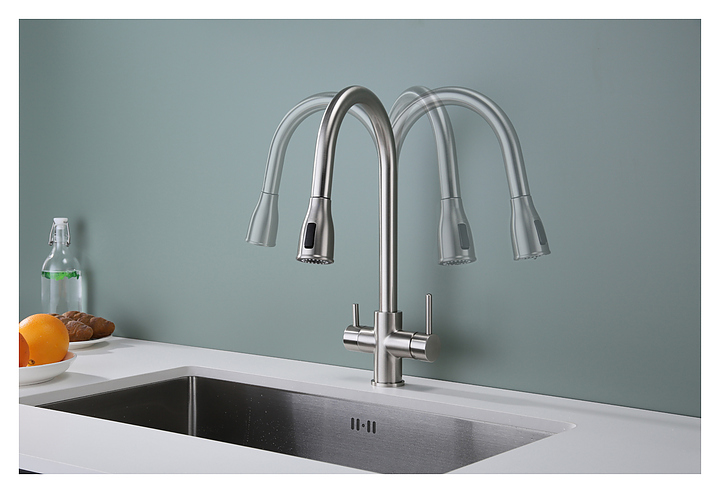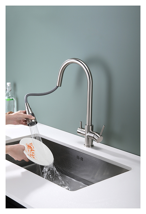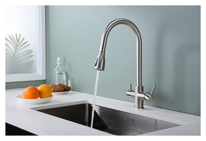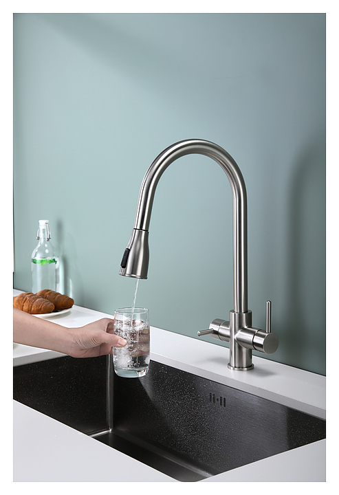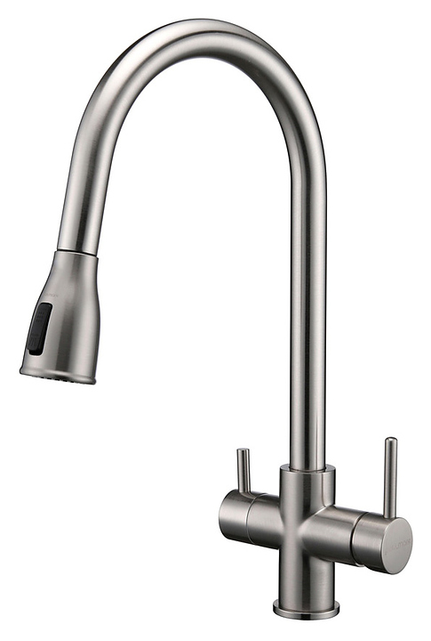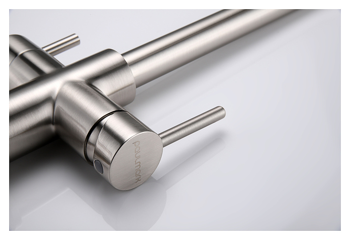 Смеситель Paulmark Lange La214212-NI предназначен для подачи горячей и холодной воды в кухонных помещениях. Вытяжной шланг облегчает процесс мойки посуды или продуктов любого размера и формы. Подключение фильтра для питьевой воды гарантирует, что питьевая и водопроводная вода не смешиваются. Изделие выполнено из латуни, отличающейся прочностью, долговечностью и устойчивостью к перепадам температур. В комплект поставки входят гибкая подводка из нержавеющей стали, усиленный комплект креплений и запасной аэратор. Дополнительные характеристики: