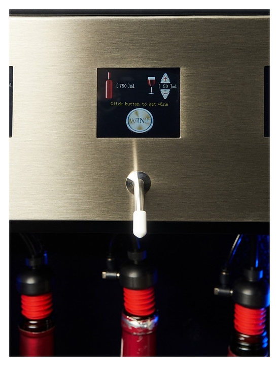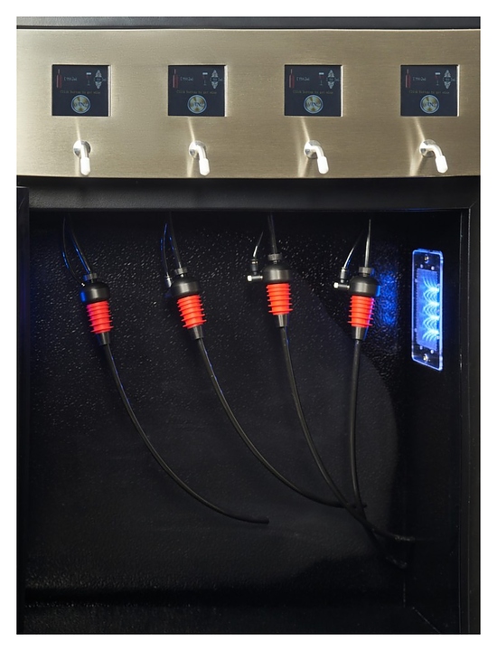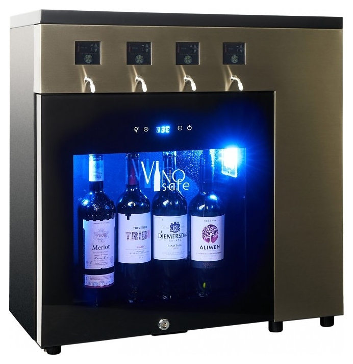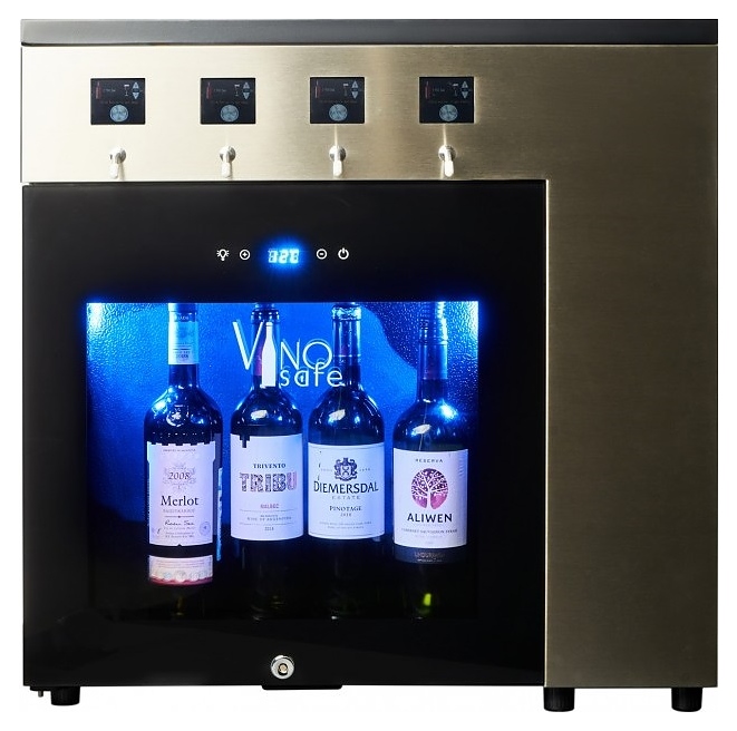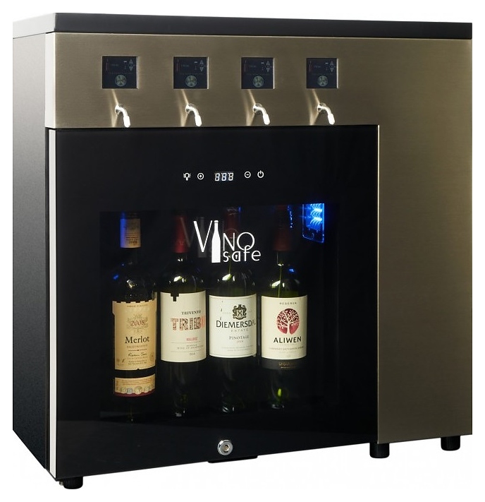 Диспенсер Vinosafe VSWD04AM предназначен для охлаждения и дозированного розлива бутилированного вина 4 различных сортов в барах, ресторанах, на других предприятиях общественного питания, а также домашних условиях. Модель оснащена холодильной камерой, системой подачи напитка с 4 заборными трубками с колпачками и 4 кранами, распашной дверью, прозрачным обзорным остеклением, внешней сенсорной панелью управления с цифровым дисплеем и 4 жидкокристаллическими сенсорными экранами для управления розливом. Корпус и рама двери выполнены из металла с антикоррозийным покрытием черного цвета, фронтальная панель – из металла с серебристой поверхностью. В комплект поставки входят ключ от замка и инструкция по эксплуатации. Особенности:
