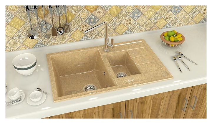 Мойка Marrbaxx Блонди Z210Q010 предназначена для установки в кухонных помещениях. Модель оснащена дополнительной чашей, а также крылом, на котором удобно располагать посуду и другие бытовые принадлежности. Изделие выполнено из кварца, который отличается внешним видом, напоминающим натуральный камень, способностью поглощать шум воды, стойкостью к действию моющих средств, экологичностью и долговечностью. В комплект поставки входят сливная арматура, герметик и фреза. Смеситель в комплект поставки не входит и приобретается отдельно. Особенности: