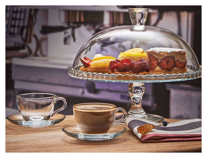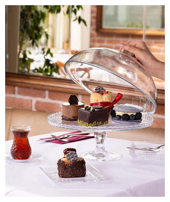 Подставка Pasabahce Patisserie 95200/b используется на предприятиях общественного питания и в домашних условиях для размещения тортов, пирожных и других кондитерских изделий в процессе сервировки стола. Модель оснащена рабочей поверхностью круглой формы с невысоким рельефным бортом и фигурной ножкой на круглом основании. Изделие выполнено из высококачественного прозрачного стекла. В комплект поставки входит полусферическая крышка с ручкой. Дополнительные характеристики: