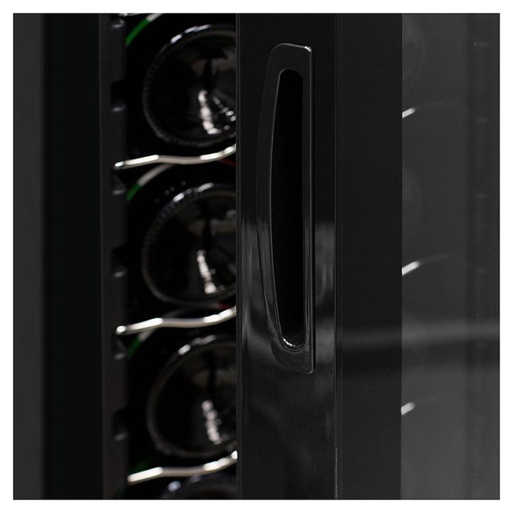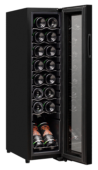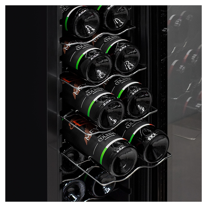Винный шкаф MEYVEL MV16-CBD1 предназначен для демонстрации, хранения и создания оптимальных условий для сохранения всех вкусовых свойств вина в бутылках на предприятиях общественного питания, торговли, в барах, ресторанах, специализированных магазинах, частных домах или квартирах. Модель оснащена сенсорной панелью управления, электронным термостатом и светодиодной подсветкой белого цвета. Корпус выполнен из окрашенной в черный цвет стали, дверь - из пластиковой рамы и двойного стекла с защитой от ультрафиолетовых лучей, полки - из хромированного металла. Особенности: