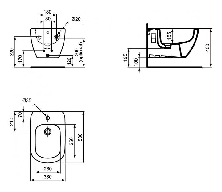 Биде Ideal Standard TESI T3552V3 за счет своего элегантного дизайна легко впишется в любой интерьер. Благодаря подвесной конструкции модель не занимает много места в помещении, а свободное пространство под чашей делает уборку в ванной комнате гораздо легче. Изделие выполнено из санфарфора, который обладает повышенной прочностью и устойчивостью к негативным внешним факторам. В комплект поставки входят крепления для установки TT0299598. Смеситель в комплект поставки не входит. Особенности: