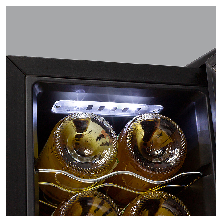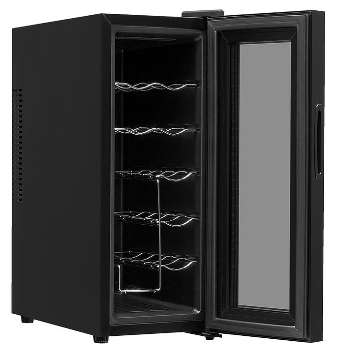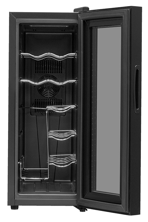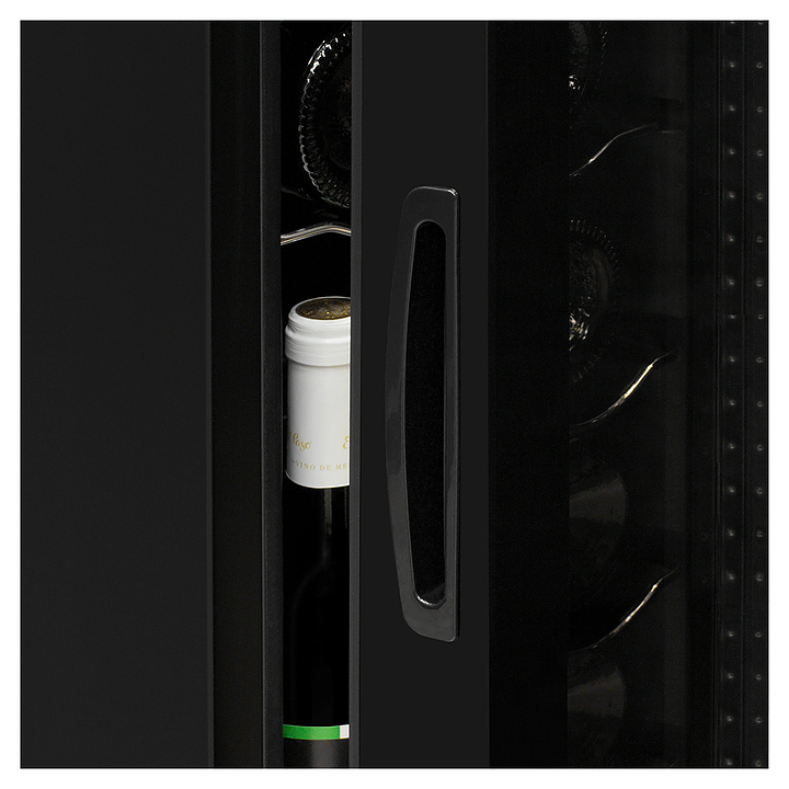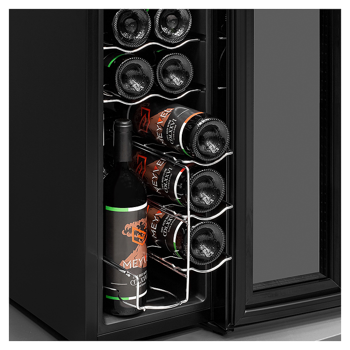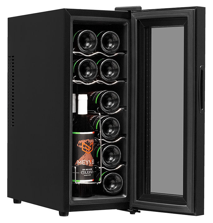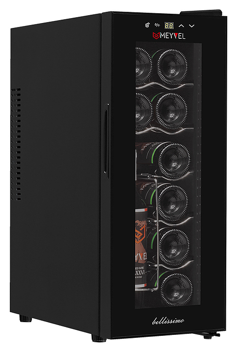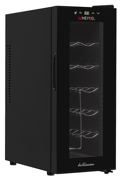 Винный шкаф MEYVEL MV12-TBD1 предназначен для демонстрации, хранения и создания оптимальных условий для сохранения всех вкусовых свойств вина в бутылках на предприятиях общественного питания, торговли, в барах, ресторанах, специализированных магазинах, частных домах или квартирах. Модель оснащена сенсорной панелью управления, электронным термостатом и светодиодной подсветкой. Корпус выполнен из окрашенной в черный цвет стали, дверь - из пластика и двойного стекла с защитой от ультрафиолетовых лучей, полки - из хромированного металла. Особенности: