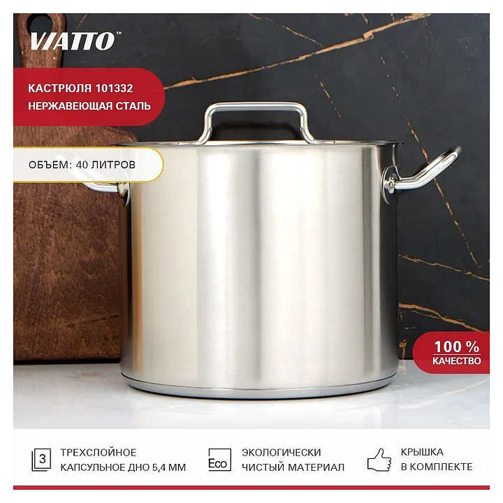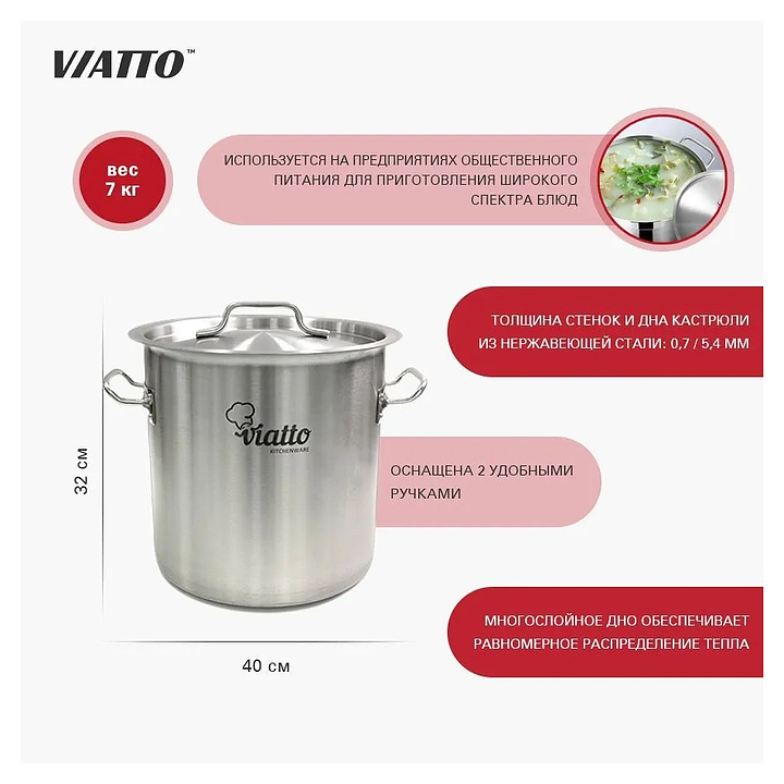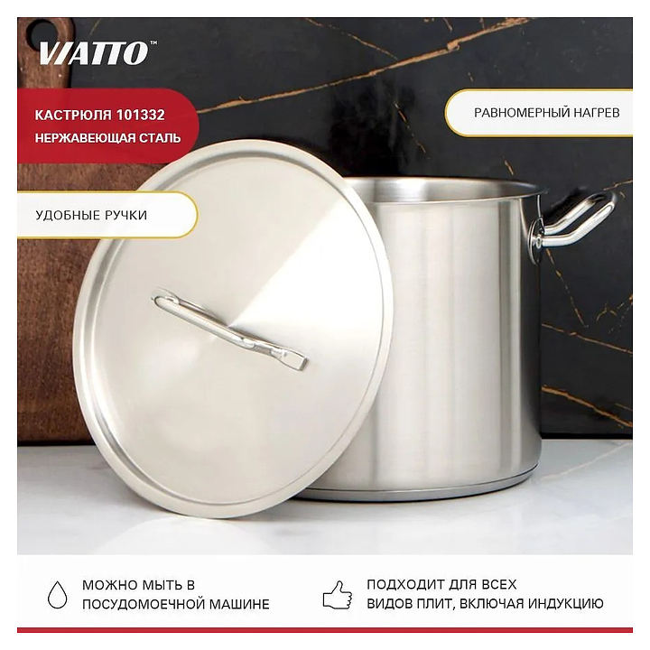 Кастрюля VIATTO 101332 используется на предприятиях общественного питания и торговли, в частных домах и квартирах для приготовления широкого спектра блюд. Модель оснащена 2 ручками на заклепках. Изделие выполнено из нержавеющей стали, дно - тройное. В комплект поставки входит крышка.