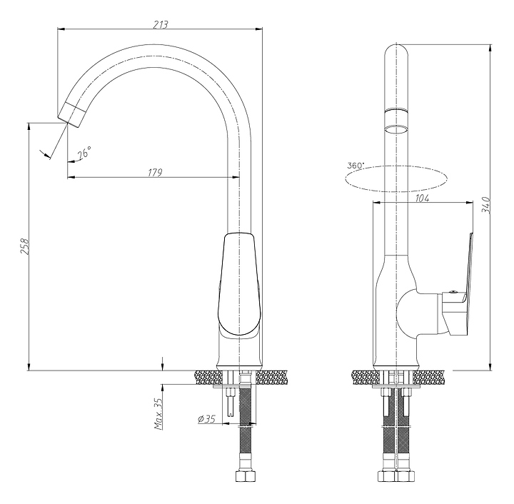 Смеситель Rossinka S35-24 предназначен для подачи горячей и холодной воды в кухонных помещениях. Модель оснащена керамическим картриджем, обеспечивающим плавный ход рычага смесителя, контроль и точность при выборе напора и температуры воды. Аэратор уменьшает шум, снижает количество брызг и оснащен функцией самоочищения. Изделие выполнено из латуни, отличающейся прочностью, долговечностью и устойчивостью к перепадам температур, рукоятка - из металла, аэратор - из пластика. В комплект поставки входят 2 подводки и гайка для горизонтального крепления. Дополнительные характеристики: