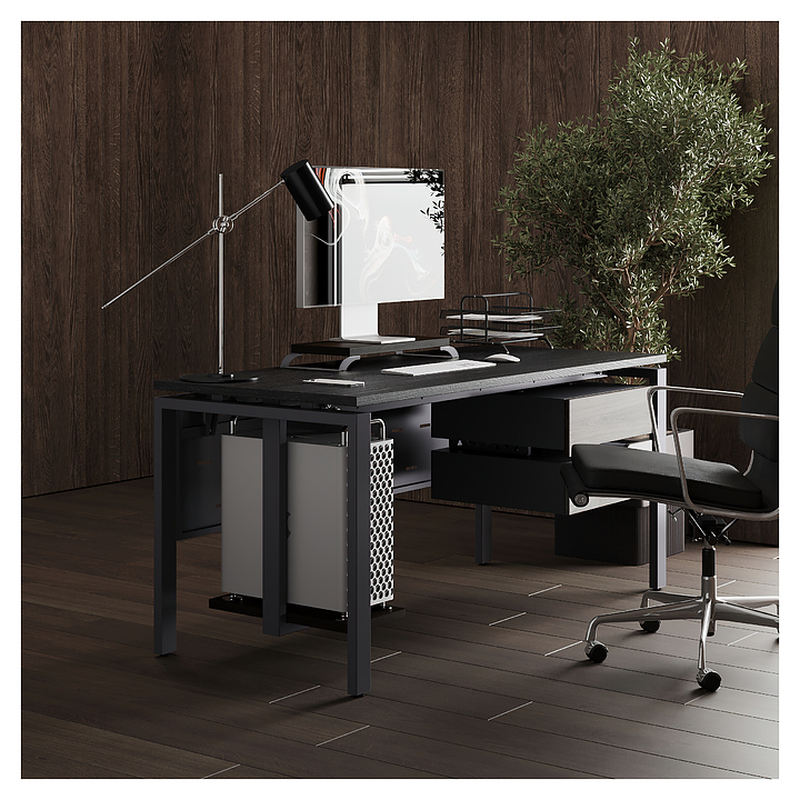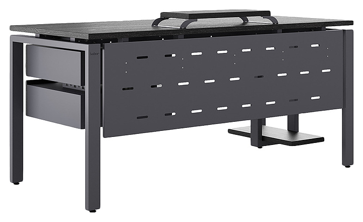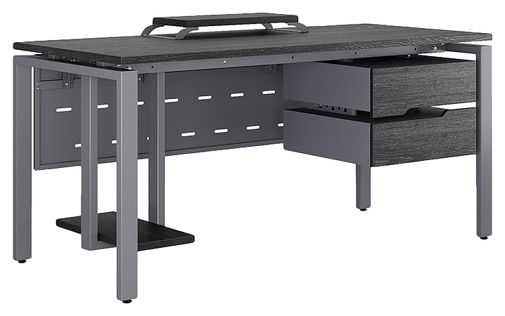 Офисный стол Кобор P-180/80 graphite/glazed используется в офисных помещениях и кабинетах руководителей. Модель оснащена П-образными опорами. Каркас выполнен из металла, выкрашенного в цвет графит муар (RAL7024), столешница – из ламинированной древесно-стружечной плиты (ЛДСП) цвета черный дуб (H3178 ST37). Опции (заказываются отдельно):