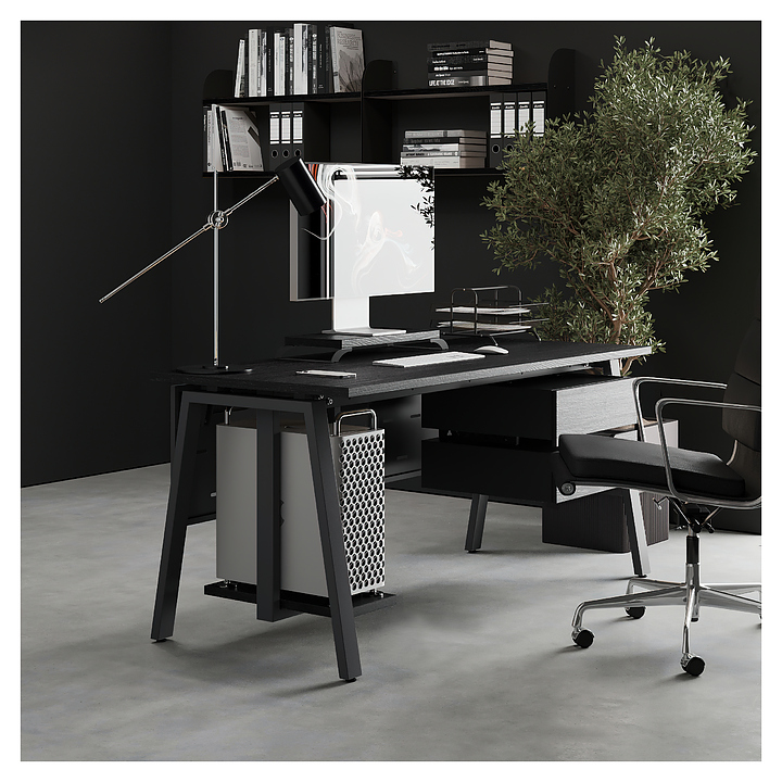 Офисный стол Кобор A-160/80 black/glazed используется в офисных помещениях и кабинетах руководителей. Модель оснащена A-образными опорами. Каркас выполнен из металла, выкрашенного в цвет черный муар (RAL9005), столешница – из ламинированной древесно-стружечной плиты (ЛДСП) цвета черный дуб (H3178 ST37). Опции (заказываются отдельно):