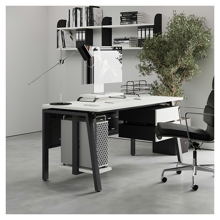 Офисный стол Кобор AB-140/60 black/premium используется в офисных помещениях и кабинетах руководителей. Модель оснащена A-образными опорами со скошенными фронтальными сегментами. Каркас выполнен из металла, выкрашенного в цвет черный муар (RAL9005), столешница – из ламинированной древесно-стружечной плиты (ЛДСП) цвета белый премиум (W1000 S9). Опции (заказываются отдельно):