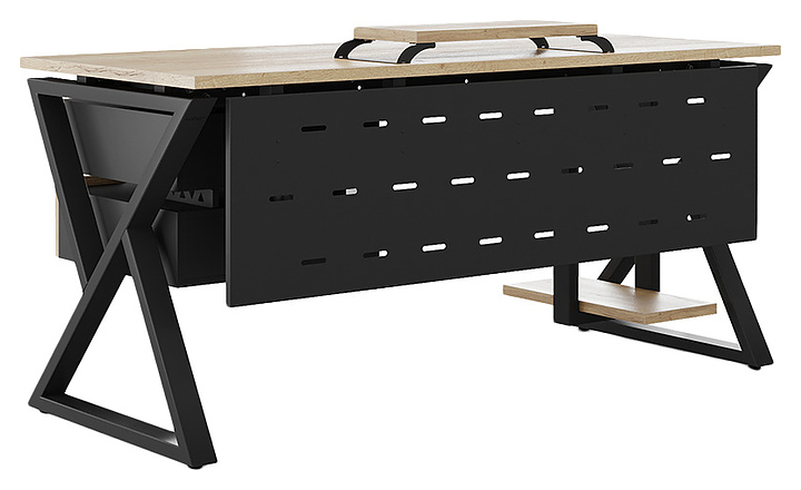 Офисный стол Кобор W-100/80 black/natural используется в офисных помещениях и кабинетах руководителей. Модель оснащена W-образными опорами. Каркас выполнен из металла, выкрашенного в цвет черный муар (RAL9005), столешница – из ламинированной древесно-стружечной плиты (ЛДСП) цвета натуральный дуб (H1180 ST37). Опции (заказываются отдельно):