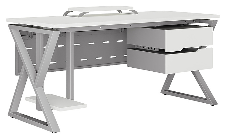 Офисный стол Кобор W-180/80 aluminum/premium используется в офисных помещениях и кабинетах руководителей. Модель оснащена W-образными опорами. Каркас выполнен из металла, выкрашенного в цвет алюминиевый металлик (RAL9006), столешница – из ламинированной древесно-стружечной плиты (ЛДСП) цвета белый премиум (W1000 ST9). Опции (заказываются отдельно):