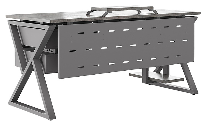 Офисный стол Кобор W-80/80 aluminum/chicago используется в офисных помещениях и кабинетах руководителей. Модель оснащена W-образными опорами. Каркас выполнен из металла, выкрашенного в цвет алюминиевый металлик (RAL9006), столешница – из ламинированной древесно-стружечной плиты (ЛДСП) цвета бетон чикаго (F186 ST9). Опции (заказываются отдельно):
